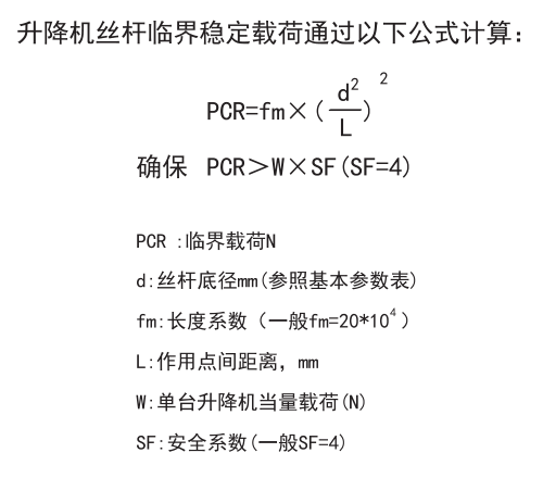 絲桿升降機的絲桿臨界穩(wěn)定載荷通過一下方式來計算: