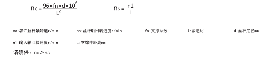 如果是螺母運動形式的話,一定要將絲桿軸轉(zhuǎn)速控制在臨界轉(zhuǎn)數(shù)一下,若超過范圍,我們會提高型號再計算。當其輸入軸轉(zhuǎn)速在900r/min以上時,或者工作在超過本啥型號的標準行程使用,請一定要核對對齊轉(zhuǎn)速。計算方式如下圖。