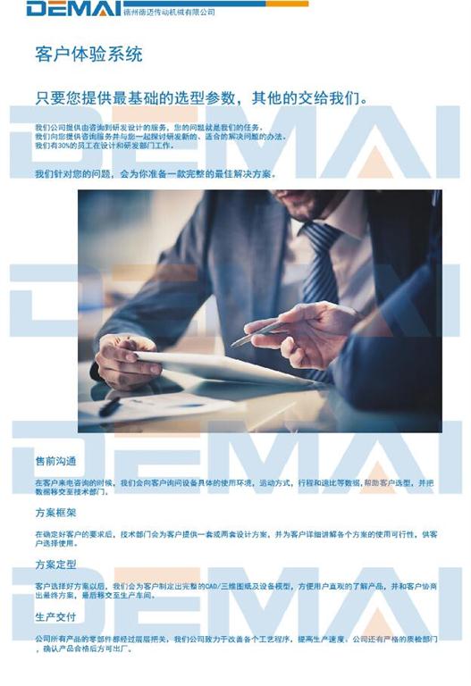 德州 德邁傳動(dòng)機(jī)械有限公司發(fā)展至今,離不開我們對(duì)產(chǎn)品質(zhì)量的嚴(yán)格監(jiān)管,對(duì)產(chǎn)品外觀的不斷創(chuàng)新,更離不開我們最引以為傲的客戶體驗(yàn)系統(tǒng)。