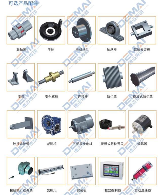 絲桿升降機(jī)在選型的時候,因?yàn)楹芏嗫蛻舻墓r以及使用環(huán)境的原因,需要裝配一些特殊的配件。今天德邁傳動就把我公司可以選配的配件分享一下,讓大家在選購升降機(jī)的時候可以根據(jù)自己的使用情況,做出響應(yīng)的配件選擇。