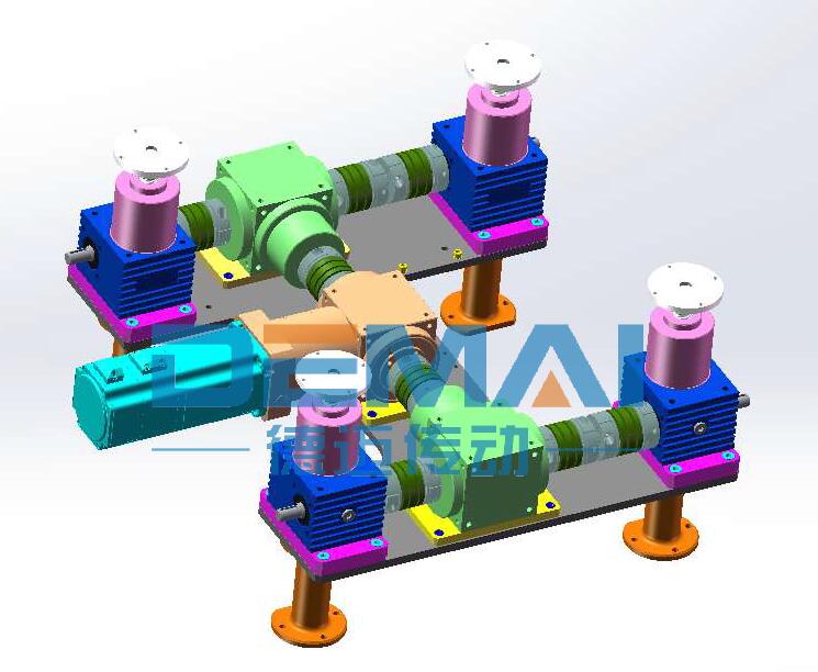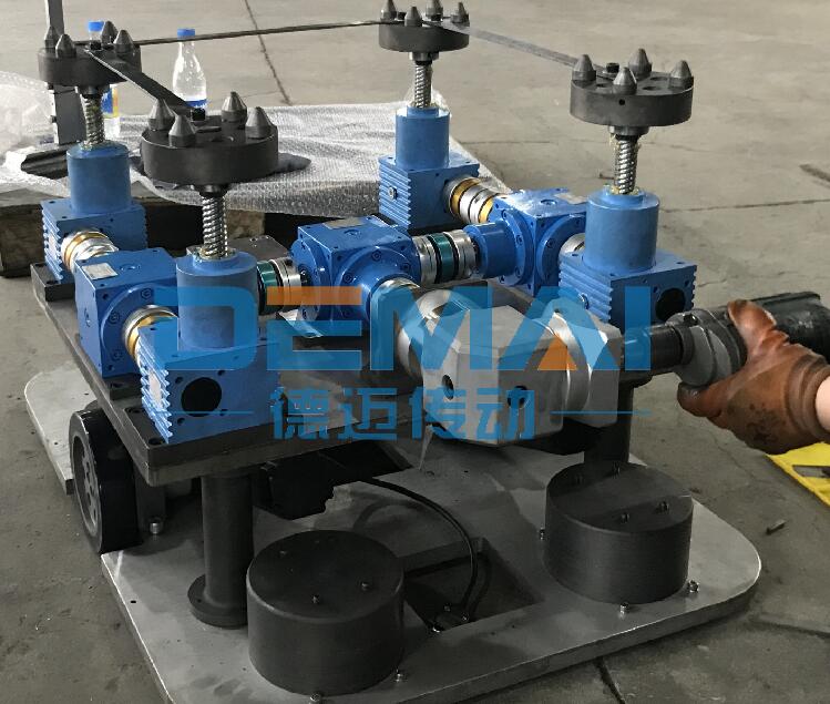 滾珠絲桿升降機(jī)同樣可以多臺(tái)聯(lián)動(dòng)使用,今天我們就四臺(tái)聯(lián)動(dòng)的方案和大家講一下滾珠絲桿升降機(jī)搭配伺服電機(jī)的優(yōu)勢。讓廣大機(jī)械工程師對(duì)于方案的設(shè)計(jì)有更多的思路和想法。 如圖所示,整個(gè)方案采用的是四臺(tái)滾珠絲桿升降機(jī)聯(lián)動(dòng),升降機(jī)采用絲桿運(yùn)動(dòng)形式,并且頭部配有法蘭接盤。升降機(jī)通過聯(lián)軸器和轉(zhuǎn)向箱連接在一起。為了保證升降機(jī)與轉(zhuǎn)向箱在同一水平線上,我們使用了升降機(jī)加裝安裝板來實(shí)現(xiàn)。由于客戶對(duì)于精度有著極高的要求,我公司生產(chǎn)的升降機(jī)精度就很高,再加上我們?cè)隍?qū)動(dòng)源的選擇上,為其選了精度更高的伺服電機(jī),以及精密行星減速機(jī),這樣整套方案的精度可到0.05mm之內(nèi),讓客戶非常滿意。